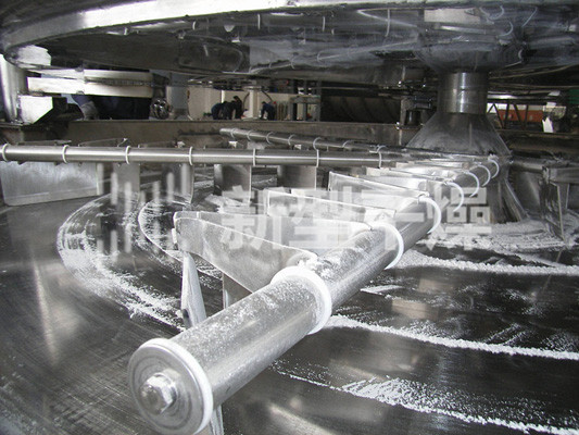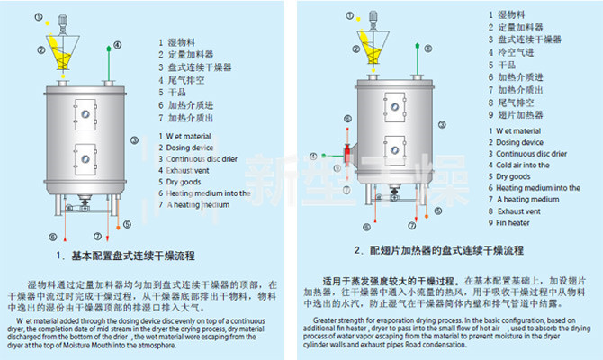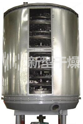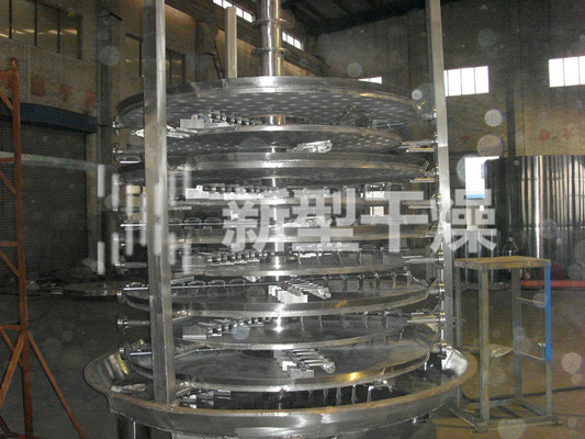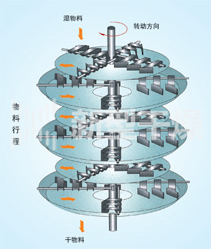 湿物料自加料器连续地加到干燥器上部第一层干燥盘上,带有耙叶的耙臂作回转运动使耙臂作回转运动使耙叶连续地翻抄物料。物料沿指数螺旋线流过干燥盘表面,在小干燥盘上的物料被移送到外缘,并在外缘落到下方的大干燥盘外缘,在大干盘上物料向里移动并从中间落料口落如下一层小干燥盘中。大小干燥盘上下交替排列,物料得以连续地流过整个干燥器。中空的干燥盘内通入加热介质,加热介质形式有饱和蒸汽、热水和导热油,加热介质由干燥盘的一端进入,从另一端导出。已干物料从下一层干燥盘落到壳体的底层,然后被耙叶移送到出料口排出。湿份从物料中逸出,由设在顶盖上的排湿口排出,真空型盘式干燥器的湿气由设在顶盖上的真空泵口排出。从底层排出的干物料可直接包装。通过配加翅片加热器、溶剂回收冷凝器、袋式除尘器、干料返混机构、引风机等辅机,可提高其干燥的生产能力,干燥膏糊状和热敏性物 料,可方便地回收溶剂,并能进行热解和反应操作。