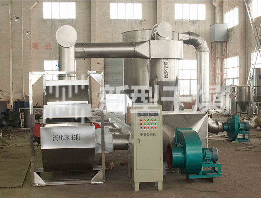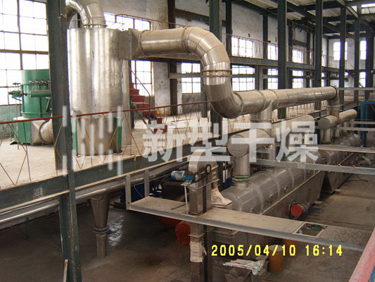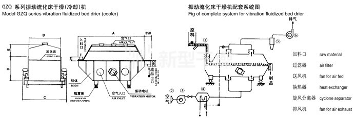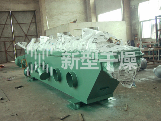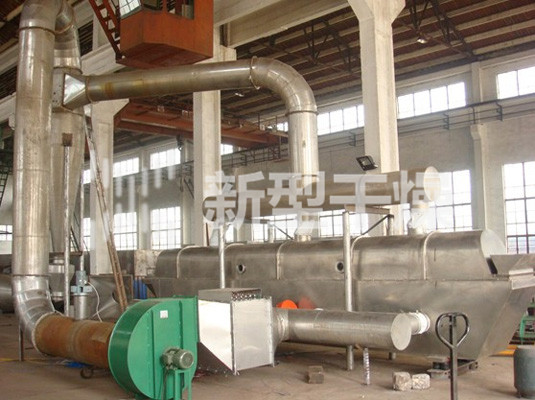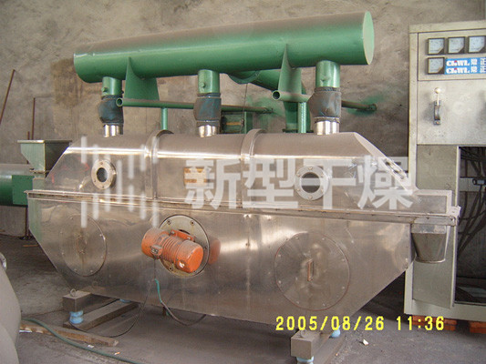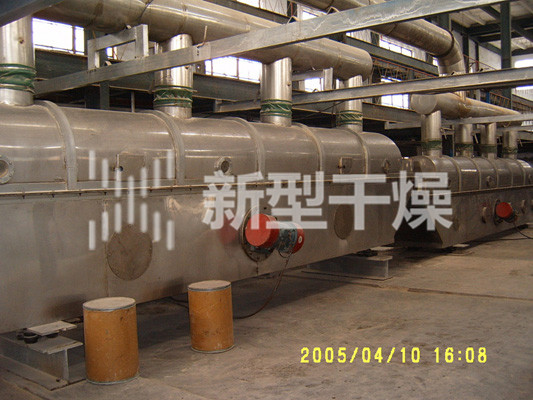 物料自进料进口进入机内,在振动力作用下,物料沿水平面流化床抛掷,向前连续运动,热风向上穿过流化床同湿物料换热后,湿空气经旋风分离器除尘后由排风1:3排出,干燥物料由排料进口排出。