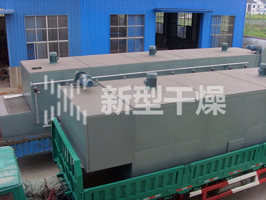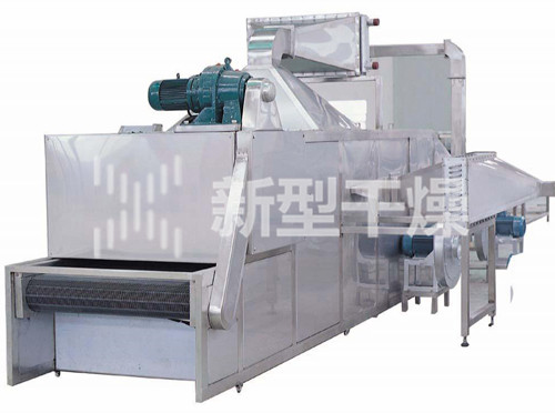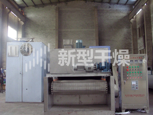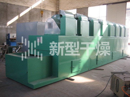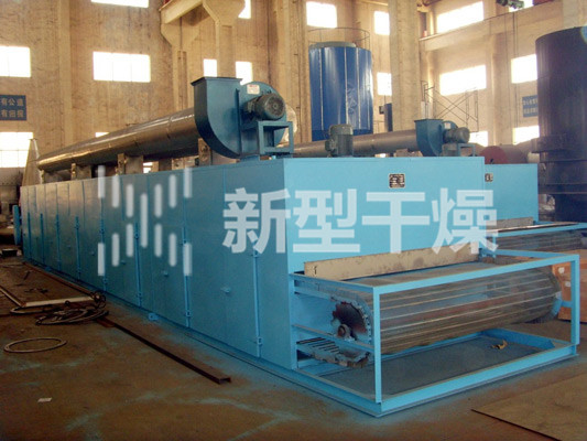 物料由加料器均匀地铺在网带上,网带一般采用12-60目不锈钢丝网,由传动装置拖动在干燥机内移动。干燥机由若干单元组成,每一单元热风独立循环,部分尾气由专门排湿风机排出,废气由调节阀控制,热气由下往上或由上往下穿过铺满物料的网带完成热量与质量传递的进程,带走物料水份。网带缓慢移动,运行速度可根据物料温度自由调节,干燥后的成品连续落入收料器中。上下循环单元根据用户需要可灵活配备,单元数量亦可根据需要选取。