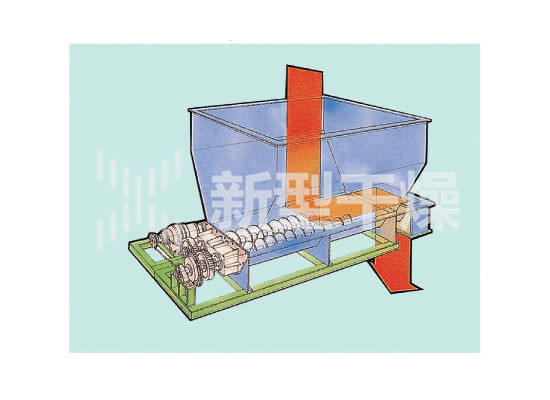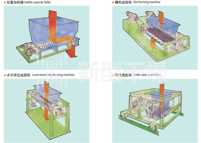 ◎水平挤出成型机: 由加料斗、二根辊子和U形振动网构成。以增大物料的表面积为目的,造粒物料与振动网接触,由旋转辊子的强制压力挤出网外,形成圆柱形的颗粒。