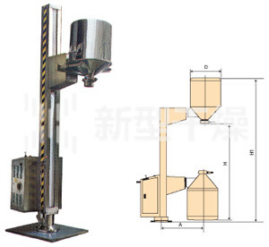 TJG 系列固定提升加料机由两部分组成,即提升机及底座。提升机由机架、液压提升系统及料门翻转机构组成。工作时,先将提升机的料门与料桶扣合,启动提升操作杆,料门与料桶一起上升,启动翻转操作杆,料桶即可番转180度,呈底桶向上姿态并移动到所需位置,利用料门上出料蝶阀,可很容易将物料加入所需的工艺设备中。